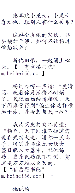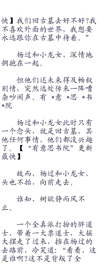 杨过也怕小龙女说出更伤心的话,急忙捂住小龙女的嘴,深情道:‘.姑姑,你切莫再要提起此事,我杨过此生此世,愿意为姑姑粉身碎骨,什么都愿意,只要姑姑你和我在一起。”