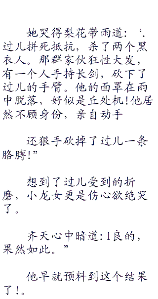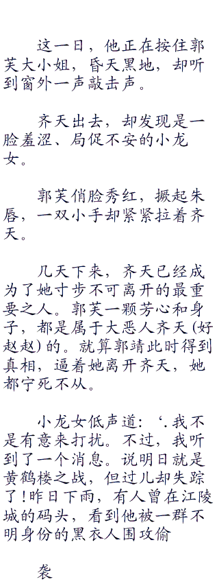 神雕侠侣 第章 调戏黄蓉!杨过去臂!3更 黄蓉抱着郭襄,听得齐天如此厚颜无耻,表面大义凛然,暗中占她便宜的卑鄙做法,芳心暗恨,却又被齐天拿捏住要害,一句话也不敢反驳,生怕这胆大妄为的家伙,对夫君郭靖说起