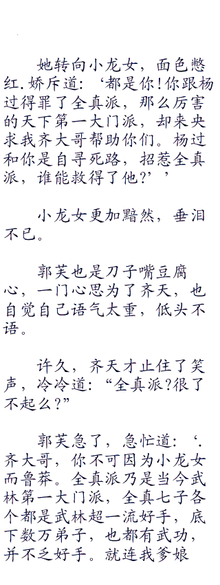 杨过乃是武林中籍籍无名之辈,揭发全真派屈膝投敌、狼心狗肺、卑鄙无耻,并公然在黄鹤楼约斗。