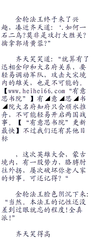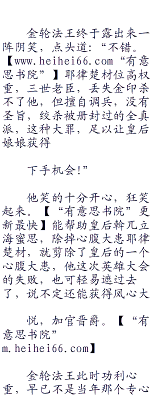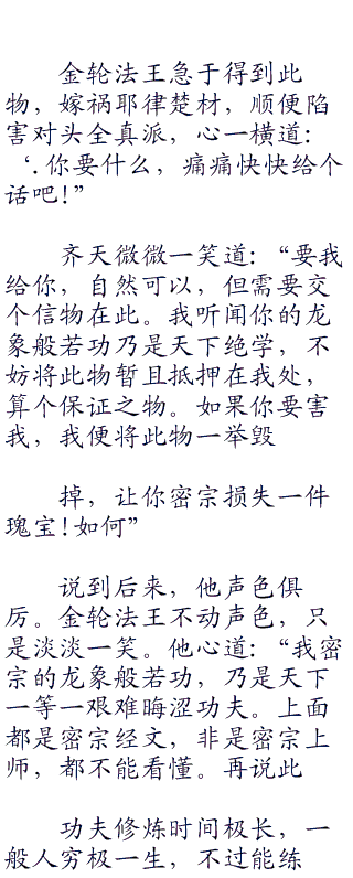 灿的,想必值点钱,就顺手牵羊弄了过来,后来回去盘算阴谋时,突然想起,把玩了一个时辰,弄清楚这正是耶律楚材的丛相金印,才起了这次追金轮法王的念头。