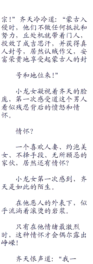 齐天话也不说,转头看了看小龙女:‘这郝大通乃是杀害孙婆婆的凶手,当年你让他自尽,他不肯,又倚多为胜,逃得一命。此时你可以复仇了。”