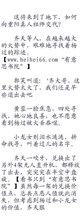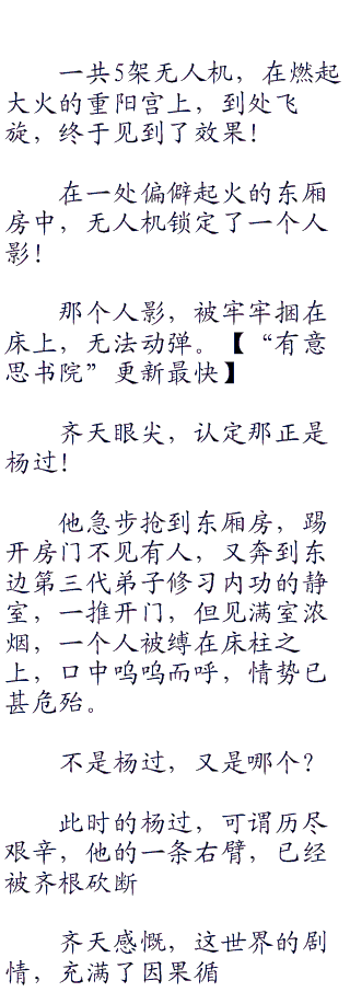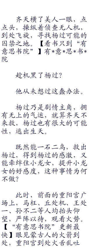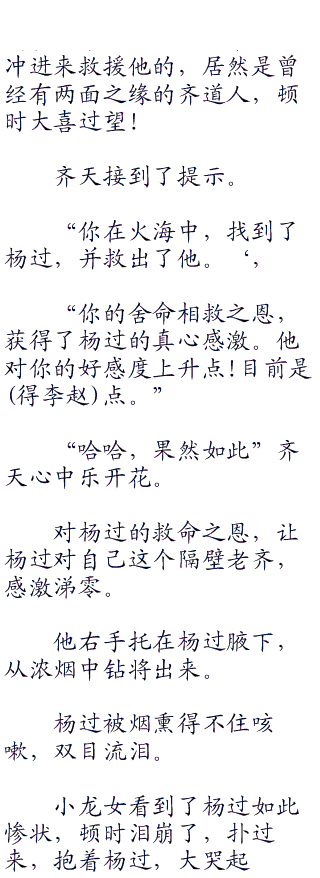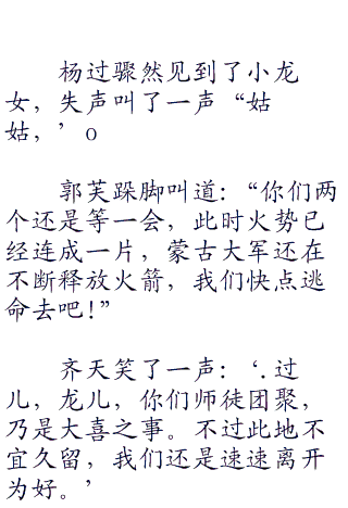 小龙女大急:“如果过儿被囚禁在此地,大火一起,岂不烧死了他?齐大哥,求你速速