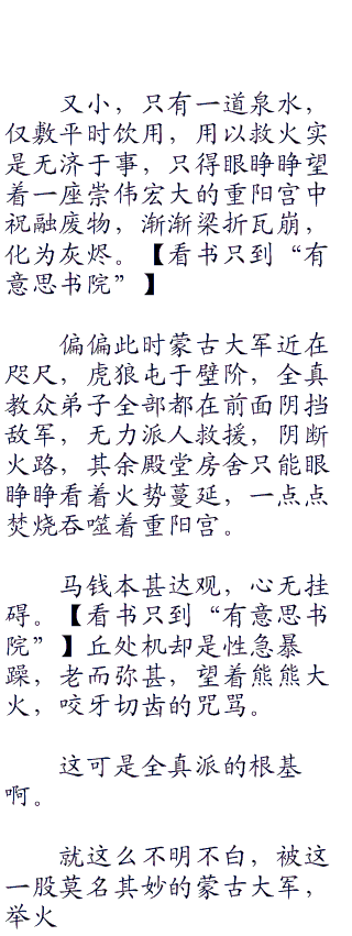 蒙古大军西征时,从不顾忌屠城焚烧,故而每每令防守方顾此失彼,阵型大乱。此时也拿出来这一招,向重阳宫发射火箭,点火焚烧重阳宫。
