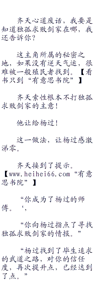 齐天嘿嘿一笑:’’如果事情简单,还叫试炼?我要传授给你的是脑子,动动脑子吧。只要能找到此物,不仅你的智谋大升,我还可以保证,你将从独孤求败的剑家和大雕的身上,学到绝世