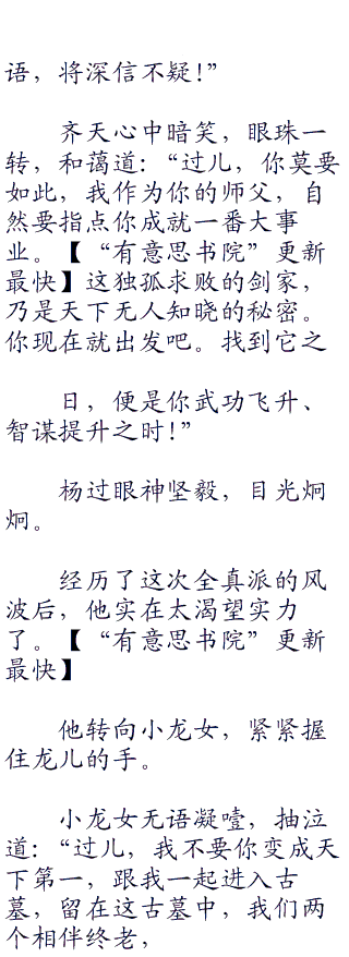 更无抗手,无可奈何,惟隐居深谷,以雕为友。呜呼,生平求一敌手而不可得,诚寂容难堪也。j你给我找到此地,将独孤求败的重剑和大雕,给我带来。就算你完成任务’ii e”