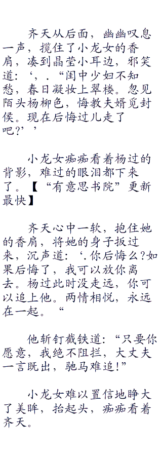 齐天冷哼一声:‘.青春年少,正是修炼之时。两情若是久长时,又岂在朝朝暮暮?”