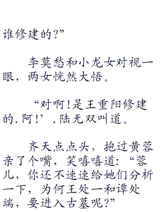 与囚禁他何异?过儿一是个男子汉,终究有一天,要离开我这古墓,离开我这师傅,独自闯荡江湖,成就自己的传奇的。”