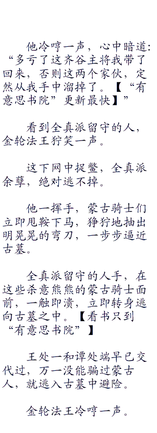 神雕侠侣 第章 引入金轮,玩死强敌!2更 王处一和谭处端果然派人占据了古墓的地下水道入口。﹋﹋﹋﹋十几个全真派道士,警惕地看着外面,生怕蒙古大军杀来。
