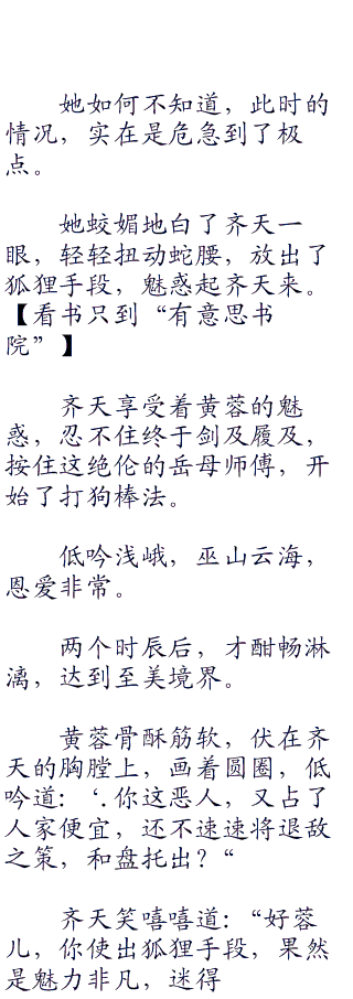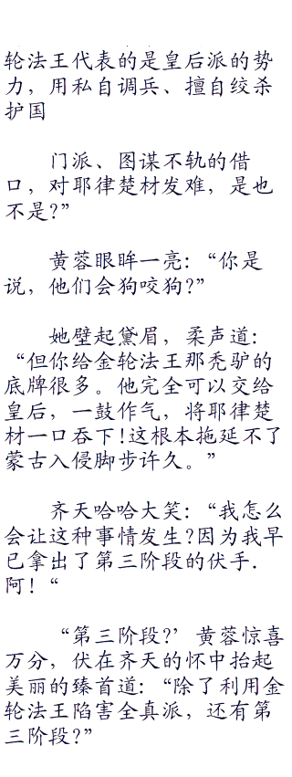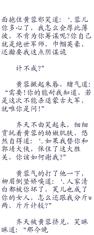 黄蓉蛟媚白了齐天一眼,娇喷道:‘.你就会混吃等死!难道不怕金轮法王迅速吃掉耶律楚材?”
