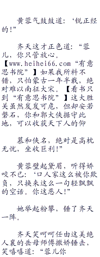 黄蓉撅起嘴,问齐天道:‘.你整日如此荒唐,难道不怕金轮法王带着蒙古大军,打过来,找你算账?”