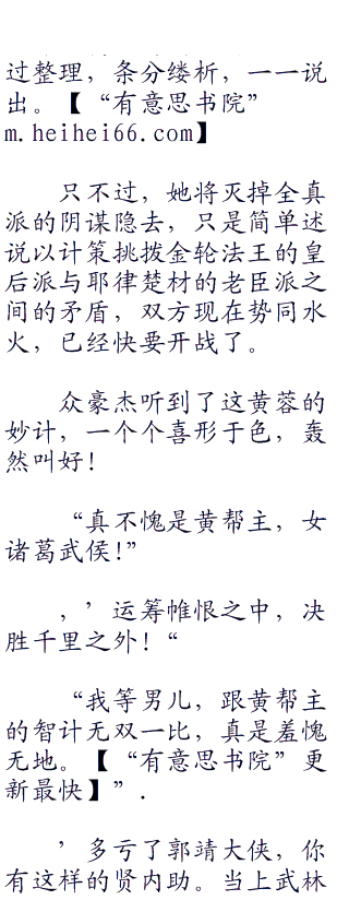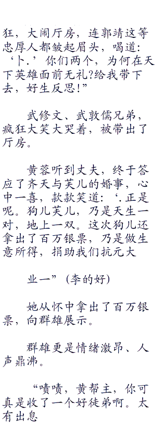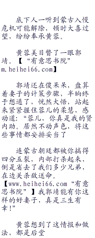黄蓉红了脸,阵了齐天一口,但一想到齐天这次算无遗策,又利用蒙古内部矛盾,挑起了皇后与耶律楚材生死之争,只怕蒙古真的无暇南顾,又得到了齐天捐赠的百万银票,芳心欢喜