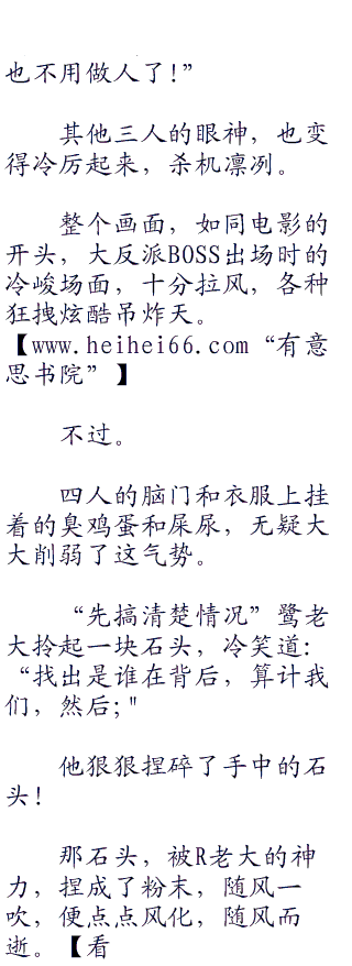 但流氓见势不妙,立即大呼小叫,周围又来了不下人,各色弯刀、菜刀、棍棒、粪叉、镰刀、不要钱般招呼下来,更有甚至,臭鸡蛋、狗血、屎尿齐上阵,打得那叫一个臭不可闻、