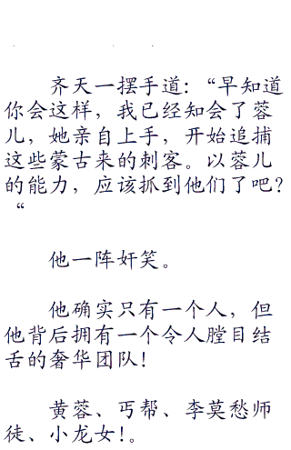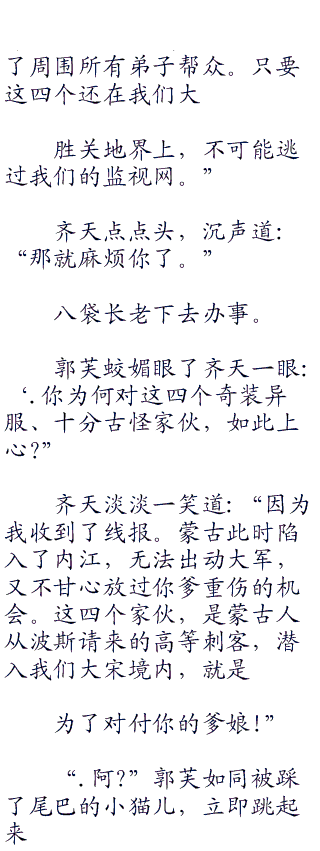 大街小巷,处处都是杀气腾腾、拎着菜刀和粪叉的百姓,无所不至,满世界转悠。官府的衙役和保甲的流氓,也在到处寻觅。还有丐帮满城行动,抓捕搜索这四个家伙。