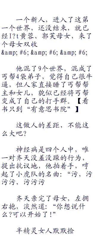 半精灵女人麻木地看着没羞没躁的齐天、黄蓉和郭芙,她这个靠卖肉为生的女殖民者,都忍不住仰天长吼了一嗓子:‘.污!你们太污了!你们的节操呢?!”