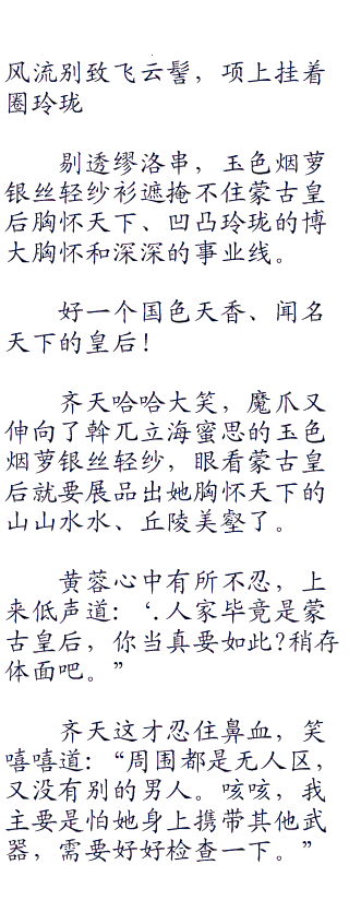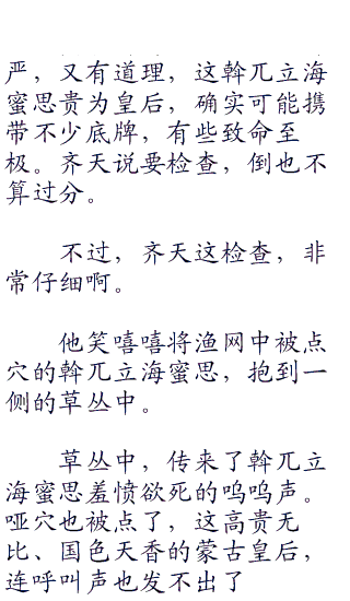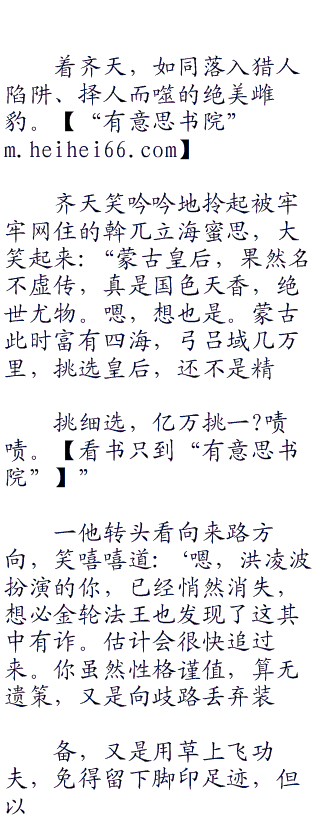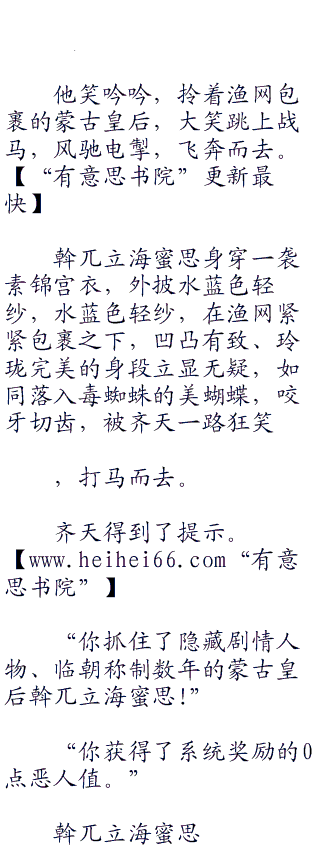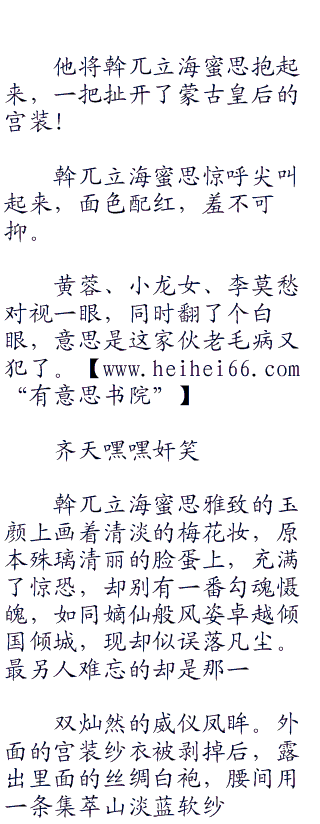 斡兀立海蜜思风华绝代,身穿一袭素锦宫衣,外披水蓝色轻纱,如同一只翩然飞舞花蝴蝶,一头撞入了齐天这恶蜘蛛布下的恶毒陷阱罗网之中!