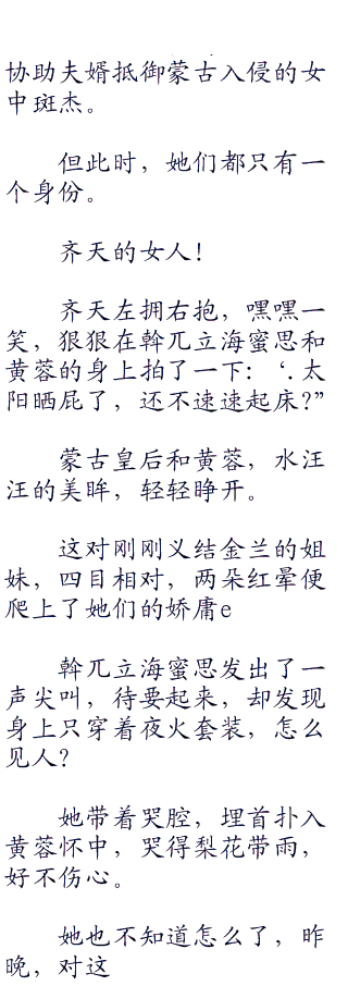 黄蓉见势不妙,急忙给义妹斡兀立海蜜思使眼色,咳嗽道:“妹子,天色已晚,我们速速回到房间休息吧。见见你郭大哥,你最是熟悉蒙古军情,我们姐妹彻夜长谈,只怕收获良多呢。”