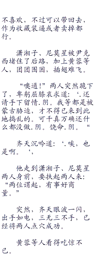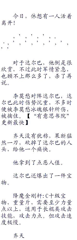 这一招仗将出来,四面八方是棒,劲力所至,便有几十条恶犬也一齐打死了,所谓“天下无狗”便是此义,棒法之精妙,已臻武学中的绝诣。手机阅读更方便m..com