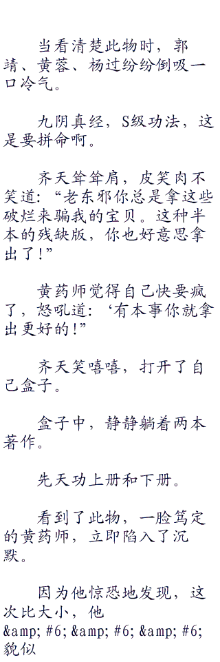 黄药师死死盯着那《剑法:一气化三清》看了半天,从牙缝中挤出一句话:‘.此物,你从何得来?”