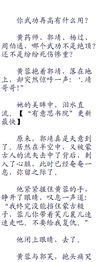 黄蓉充满感激地看着齐天,抱起郭靖,徐徐飞了起来。