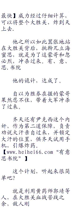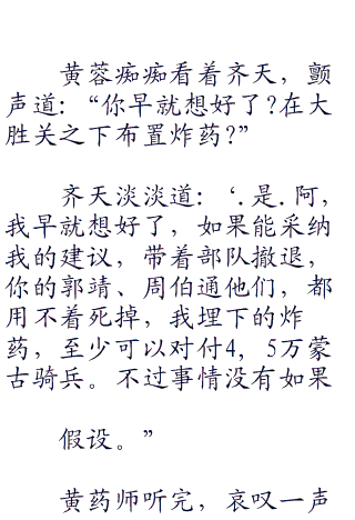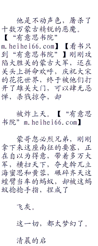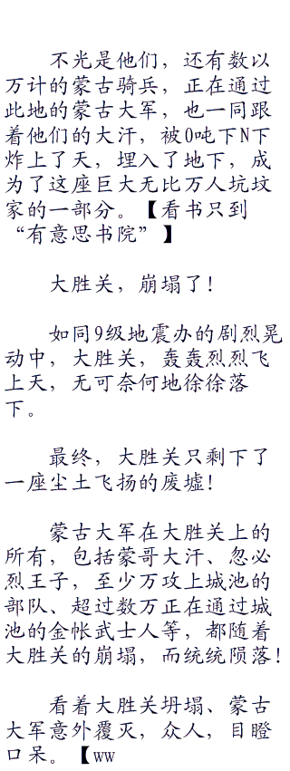 大胜关,这座抵抗了蒙古数次慢略的雄关,经过一夜血战,没有被蒙古人征服过的天险,却已经如同两腿被砍断的强者,玉山倾倒,徐徐吟着,一声又一声巨大的爆炸声,响彻它的城