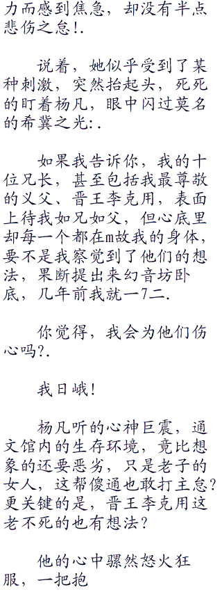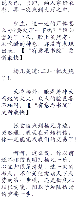 杨凡的衣衫,一直是姬如雪带着的,他也从行李中找了件衣服,一边穿着,突然看似随蔽的问道:.我杀了李嗣昭、李存忠、李存孝,你为何并不如何悲伤?难通你就不恨我?’.
