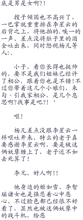 杨凡也很是无语,这才想起来,李星云喝多了之后,貌似比起张子凡也好不到哪儿去.…