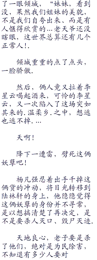 更何况,杨凡身边还跟着好几个寻常难得一见的绝色女子,一看就是大有来头的人物:当然,在陆林轩这个单纯少女的心里,这种人物应该都不会是坏人吧?