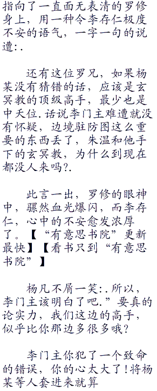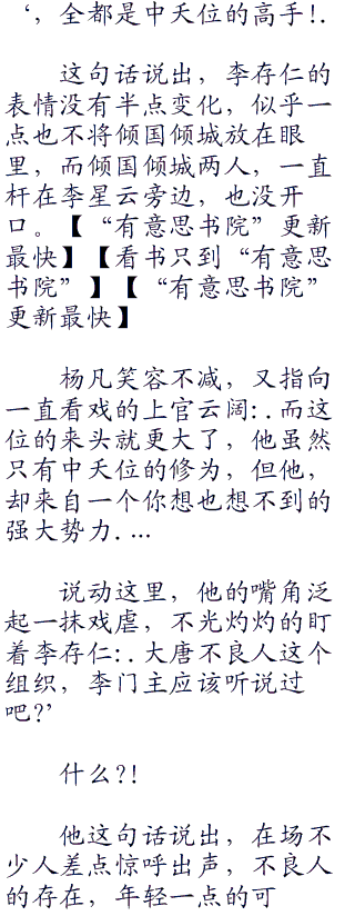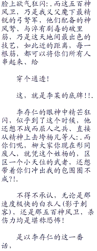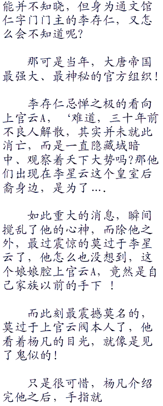 众人心思各异,却见李存仁突然一指高台边缘的那个白衣人:’此人的修为只有中天位,但却是天底下最出色的刺客,他的速度天下无双、暗杀之术无人能出其右…而他,是我的影子!.