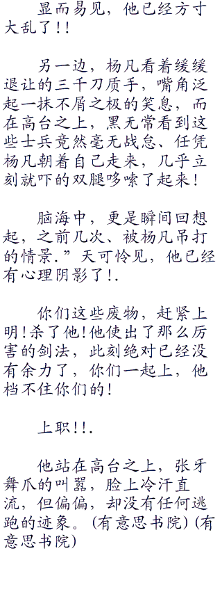 三千刀盾手耳边听着黑无常的帷嚎,一个个都吓尿了啊有木有,这么远的距离一剑袅首,这些士兵尽管征战沙场多年,别说见过了,听都没听说过这种事清啊!