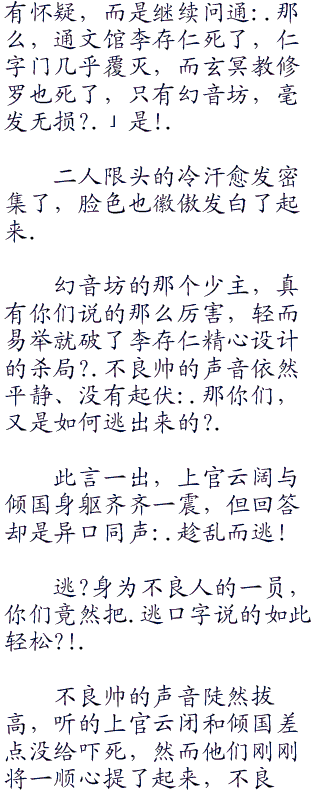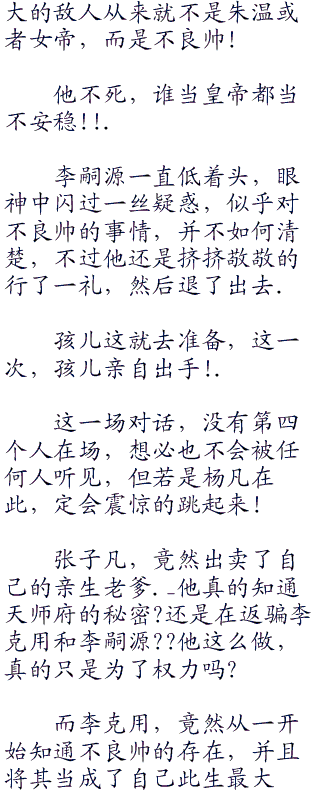 张子凡淡淡一笑:’启票义父,上次杨凡来通文馆之时,曾将一张纸条暗中交给孩儿,是以,孩儿已经知遭了自己的身世.从那之后,孩儿的脑海中,就不停的浮现出小时候的场景,直至最近,终于想起来了一点!