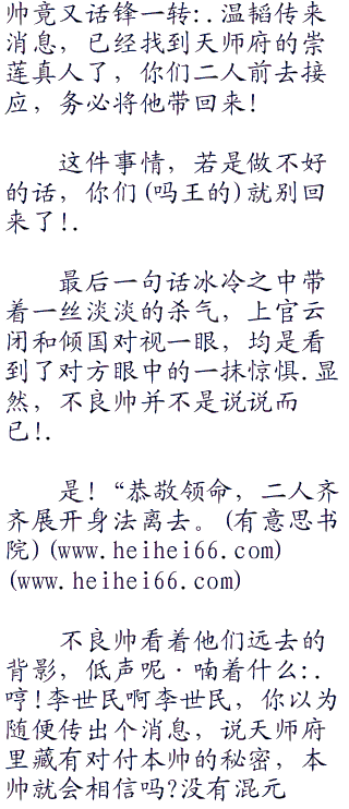 张子凡眸光一闪:.小时候,孩儿曾无惫中听到过,在天师府中,存在着一处秘境,里面封存着一个天大的秘密,传闻只要找到了这个秘境,就可以无敌于天下!.