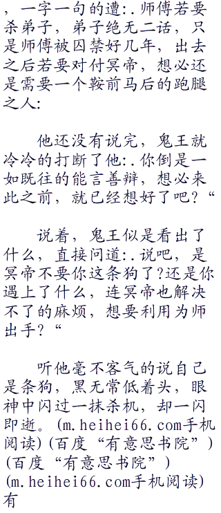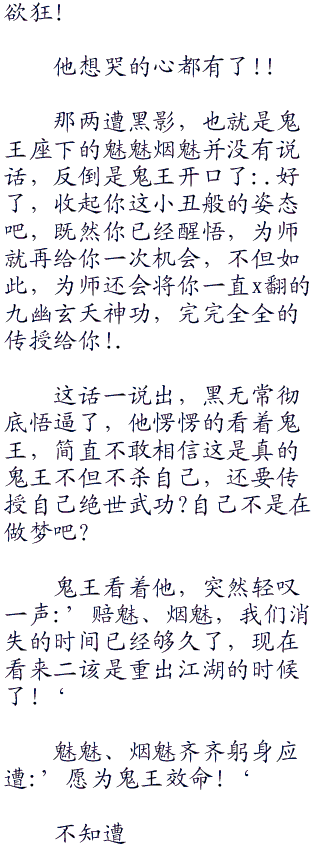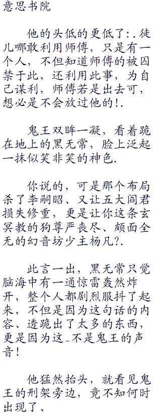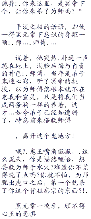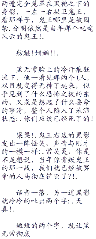 鬼王看着黑无常,如刀削般的狭长眼睛散发着幽幽的光芒,丝毫也没有身为囚犯的感觉,整个人的气质反而显得格外