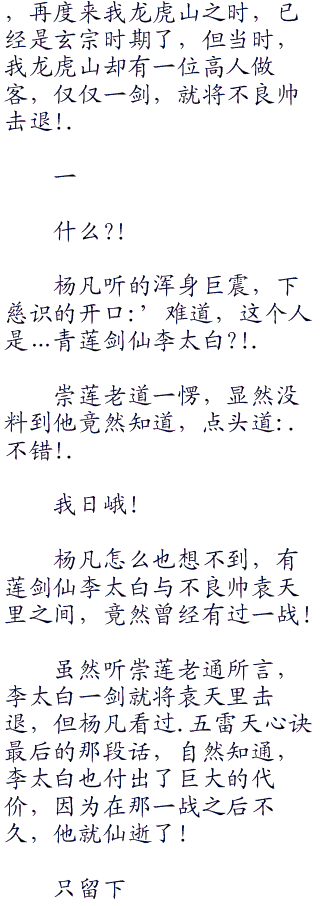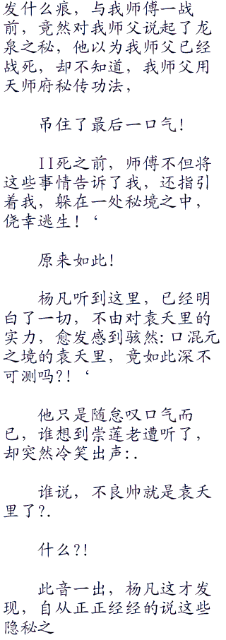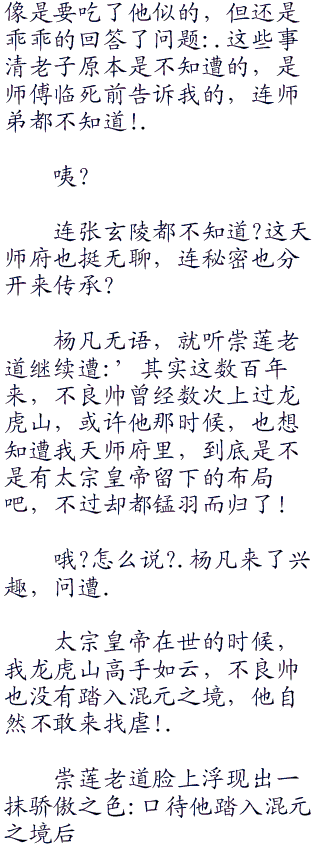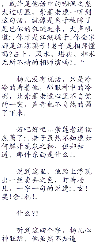 杨凡彻底无语了:.也就是说,你这个天师府的.首席口天师,其实就是个恤点相术的江湖骗子!!.
