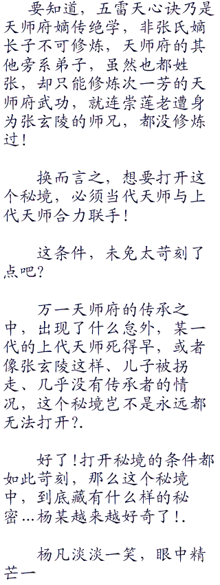 这.…原来,打开秘境的方法,竟然是五雷天心诀!还必须要有两个、均是大天位水平的高手合力才行!.