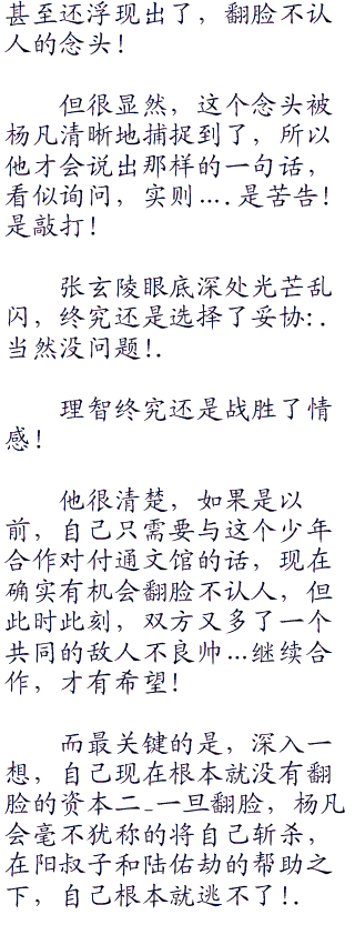 杨凡和张玄陵同时收回右手,竟然均是深深的吸了一口气,这短短的时间之内,两人竟都是消耗极大!