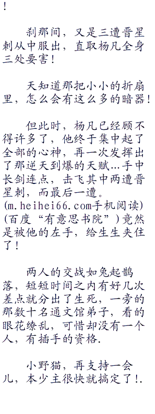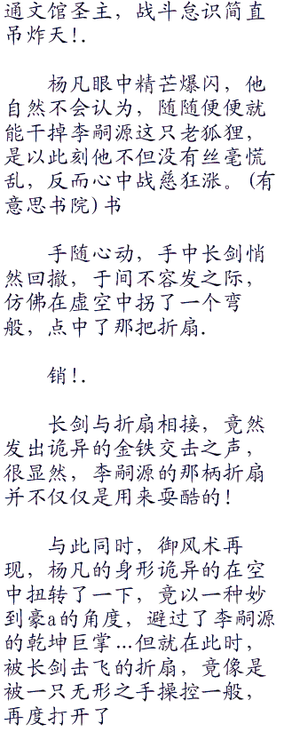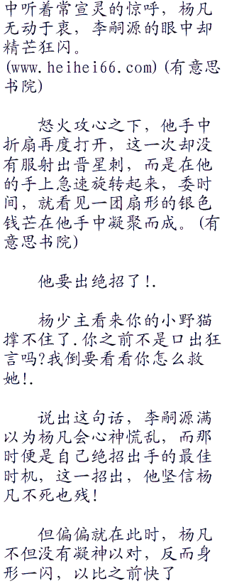 呼啦!.风声瑟瑟作响,服飞而出的折扇,竟像是一柄飞刀一般,带着丝毫不弱的往芒,以绝快的速度直取杨凡的脖颈.若是杨凡继续此处手中长剑,固然可以刺穿李嗣源的手掌,但他的咽喉,也会被折扇刺穿!.