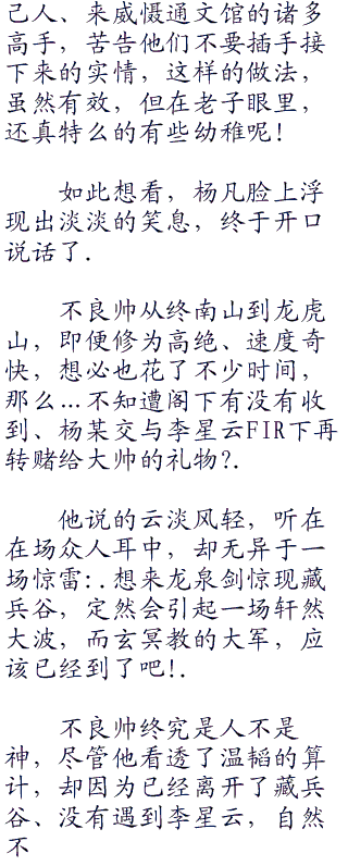 杨凡表面无动于衷,但心里的思绪却以前所未有的速度运转看,在他的猜测里,突然而至的应该是温韬啊,那个在自己面前玩心计的男人,他故蔽让崇莲老遭被救走,不就是希望其能将李星云引到龙虎山吗?