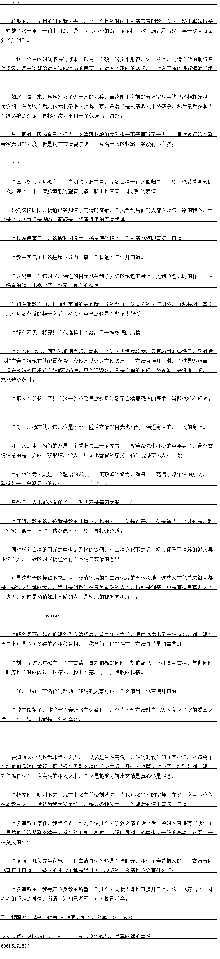 属人杨道参见教主:“光明顶大殿之中,见到玄清一行人口归之后,杨道也带着明教的