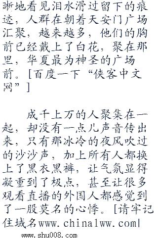 央视直播大厅中一片沉默,没人敢开口,甚至敢说一个字,老太太依然还躺在一位泪水满面的女主持怀中,只是已经没了一点点的呼吸。