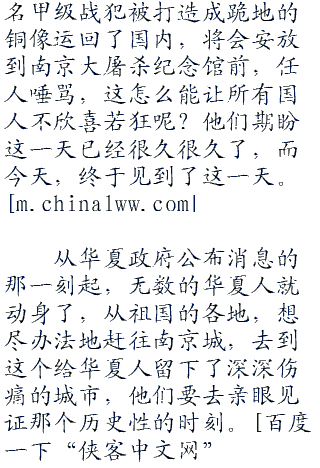 在华夏,这个时候,却早已经沸腾一片了,再一次陷入了一片巨大的欢呼声中,日本首相安倍晋三协同政府高层将来到南京,对死难者致歉,并且二战的十四