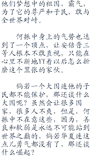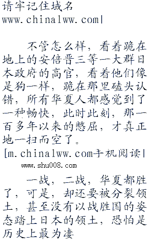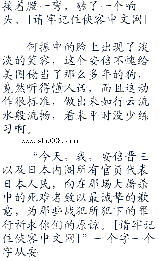 安倍晋三抬头,看向了何振中,因为巨大的耻辱,他的脸已经变得像是僵尸脸一样了,无悲无喜,看起来狰狞恐怖到了极点,他知道何振中想要说什么。他很快移开了头,看向了那面刻着三十万死难者名字的石壁,双手抬起,