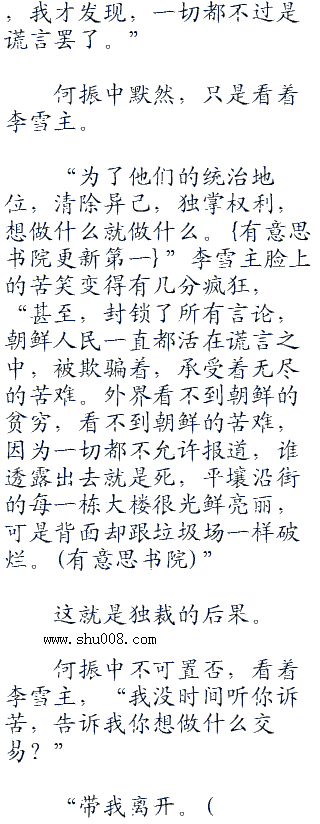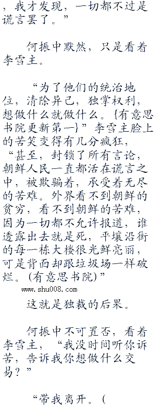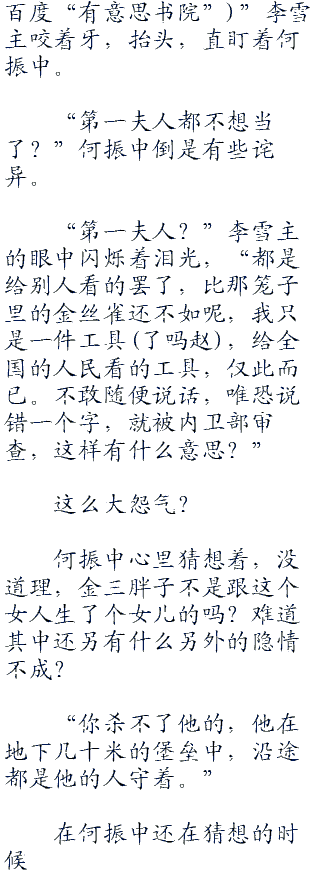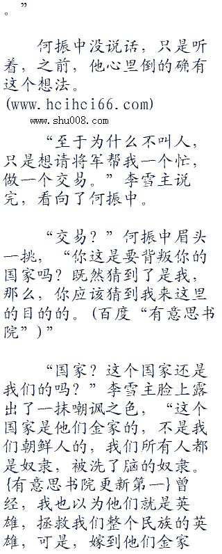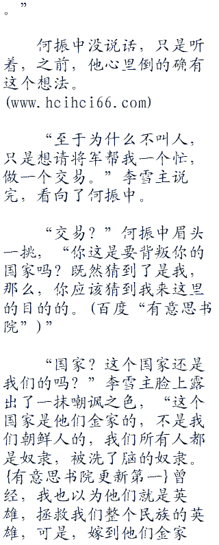 的确,何振中没想到会在这间房间中看到李雪主,而且还是一个女人,从她的穿着来看,应该是洗漱之后要睡了,可是金三胖子明明回来了,却不见人,这么大半夜的,扔下自己老婆一个人独守空间,难道不奇怪吗?