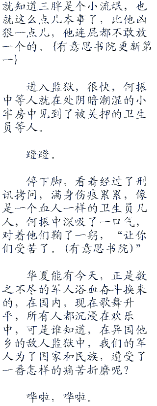 那些朝鲜兵让开了一条通道,看着何振中带着人大步地朝着监狱里面走去,他们每一个人的脸上都是痛苦之色,这份屈辱,他们只能承受了。