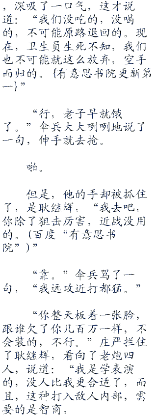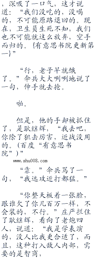 听见老炮的声音,庄严,耿继辉,伞兵,强子都扭头,看了过去。