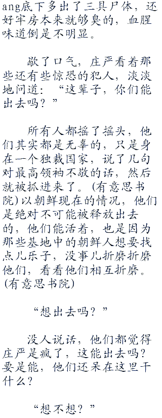 等到肚子涨得快炸开了,庄严这才停下来,趴在尸体上喘着气,太爽了,总算是不饿不渴了。他眼睛瞄了一眼四周,那些原本穷凶极恶的犯人都像是小绵羊一样,老老实实地靠着墙,惊恐地看着他。