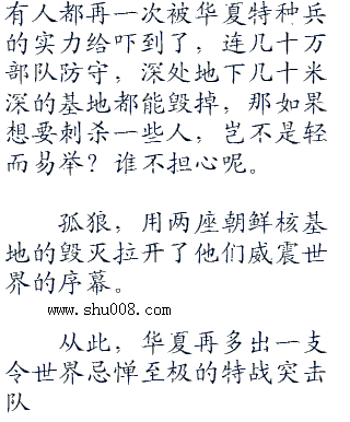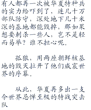他们知道,又一支顶尖的特战突击队将扬名整个世界,为各**方所忌惮了,深入千里,在几十万朝鲜大军的防守中渗透,成功毁掉地下核基地,这份战斗力足以让所有人都感到心悸了。