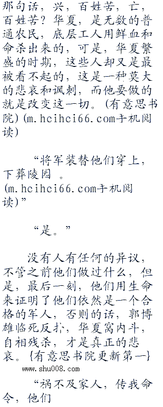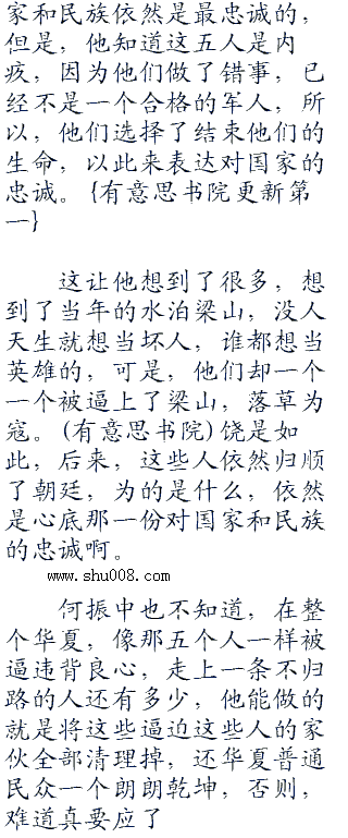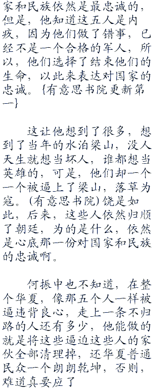 所有人都震住了,直盯着五具尸体,眼中饱含着泪水,脸上却满是笑容,很矛盾的感觉,可是,这一刻,他们却都懂了,泪水是因为悔恨,他们背叛了祖国和他们入伍的誓言,笑容是因为他们终于解脱了,用生命赎清了他们的罪孽。