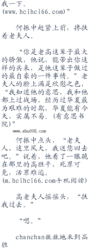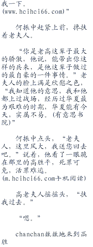 何振中停下了脚步,看着已经满头白发,需要人搀扶着走路的老太太,他的心也忍不住猛的一抽,高老夫人已经如此年迈了,刚刚送走了她的丈夫,难道真的还要让她老年丧子,孤独终生,无人送终吗?