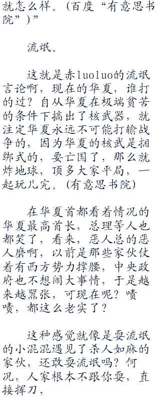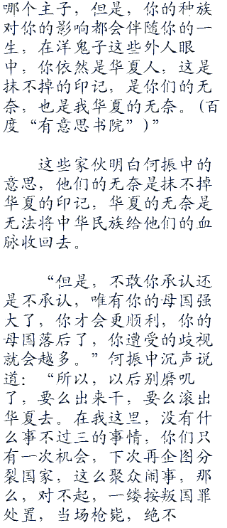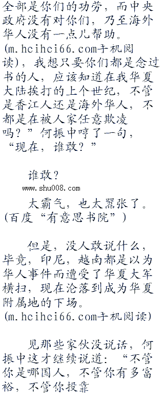 “地球离了谁一样会转,别把你们自己想的那么重要,懂吗?”何振中哼了一句,“也许你们会说你们不愿做华夏人,没关系,华夏欢迎你们离开,随时都可以。也许,你们也会说这里是你们的,也没关系,觉得是你们的,那么来拿吧,打得过大陆,你们想怎么样