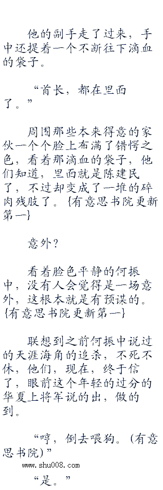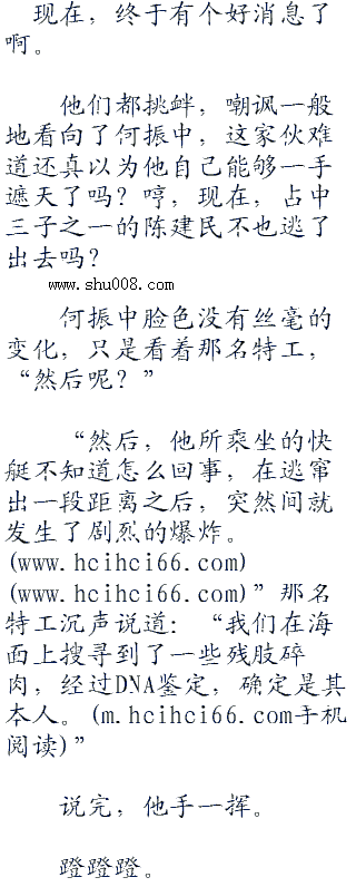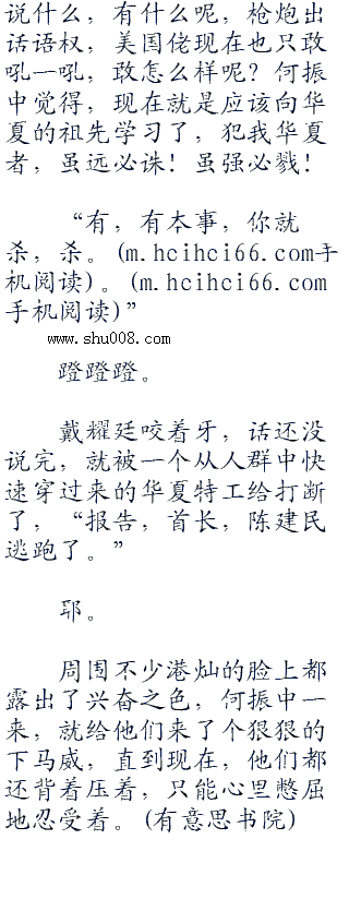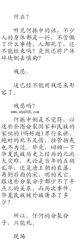 华夏容忍了太多,退让了太多,以至于现在很多人还以为现在的华夏是几年前那个华夏,不敢对他们怎么样了,哼。何振中就是要用鲜血让所有人都知道,现在的华夏,强势,强大,容不得半点儿挑衅。
